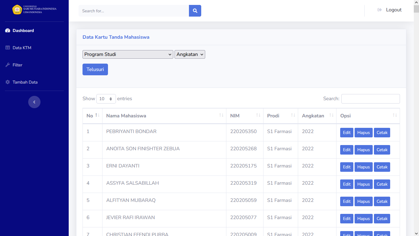 4. Halaman Data KTM, tampil seluruh data mahasiswa yang sudah mengisi